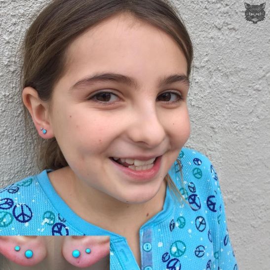 I got to hang out with the bravest 10 year old the other day! Anya had her earlobes pierced previously by a gun at the mall, and the results were a bummer. She let them heal up, and we gave her ears a fresh start. Shoutout to NeoMetal for their high quality jewelry that is safe and comfortable in fresh or healed piercings ♡ I love my job! via Instagram