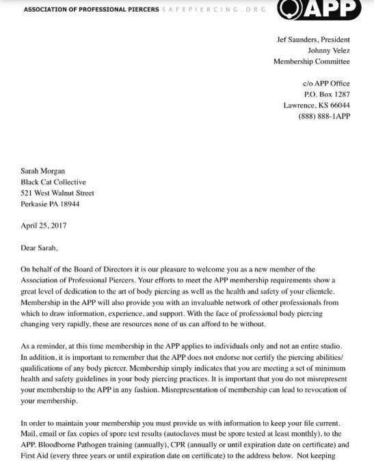 Professional Body Piercer of ten years, Association of Professional Piercers member, Owner/Head Piercer at Black Cat Collective in Perkasie, Pa.